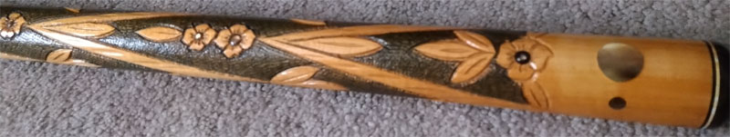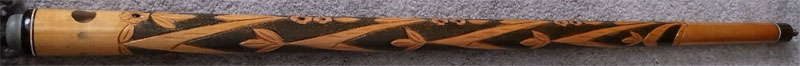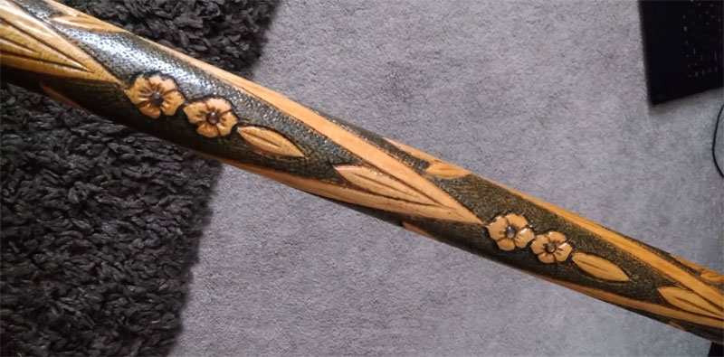 One-piece hornbeam butt, floral engraved handle with black mother-of-pearl dots in the centers of the flowers between ebony and ivory rings at top and bottom.