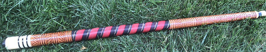Wondering if anyone can help me identify this leather-wrapped carved wood cue with a brass joint?