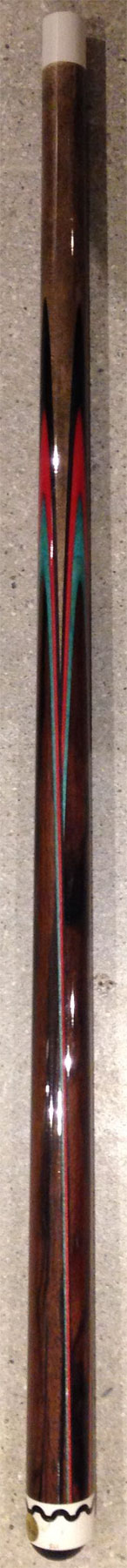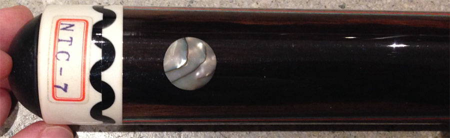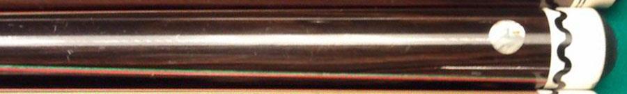The forearm design is called a "butterfly splice" e.g. the veneers come to an oval-shaped point, instead of a sharp triangular point. The inlaid circle in the butt is made from mother-of-pearl. The wooden joint screw is common and typical for 3-cushion and carom cues.