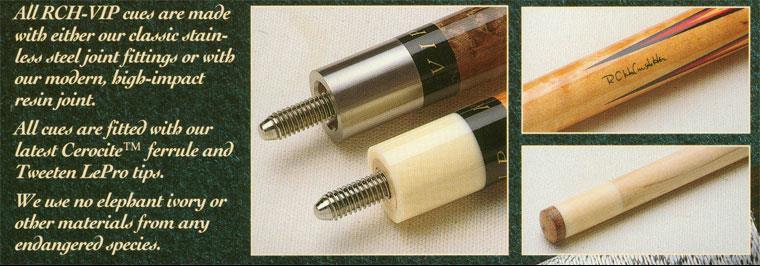 As I begin my 4th decade of cue-making, I am very proud to present our first Series for the 1990s. The RCH-VIP cues. They probably are the very best we've ever made. All RCH-VIP cues are made with either our classic stainless steel joint fittings or with our modern, high-impact resin joint. All cues are4 fitted with our latest Cerocite⢠ferrule and TWeeten LePro tips. We use no elephant ivory or other materials from endangered species.