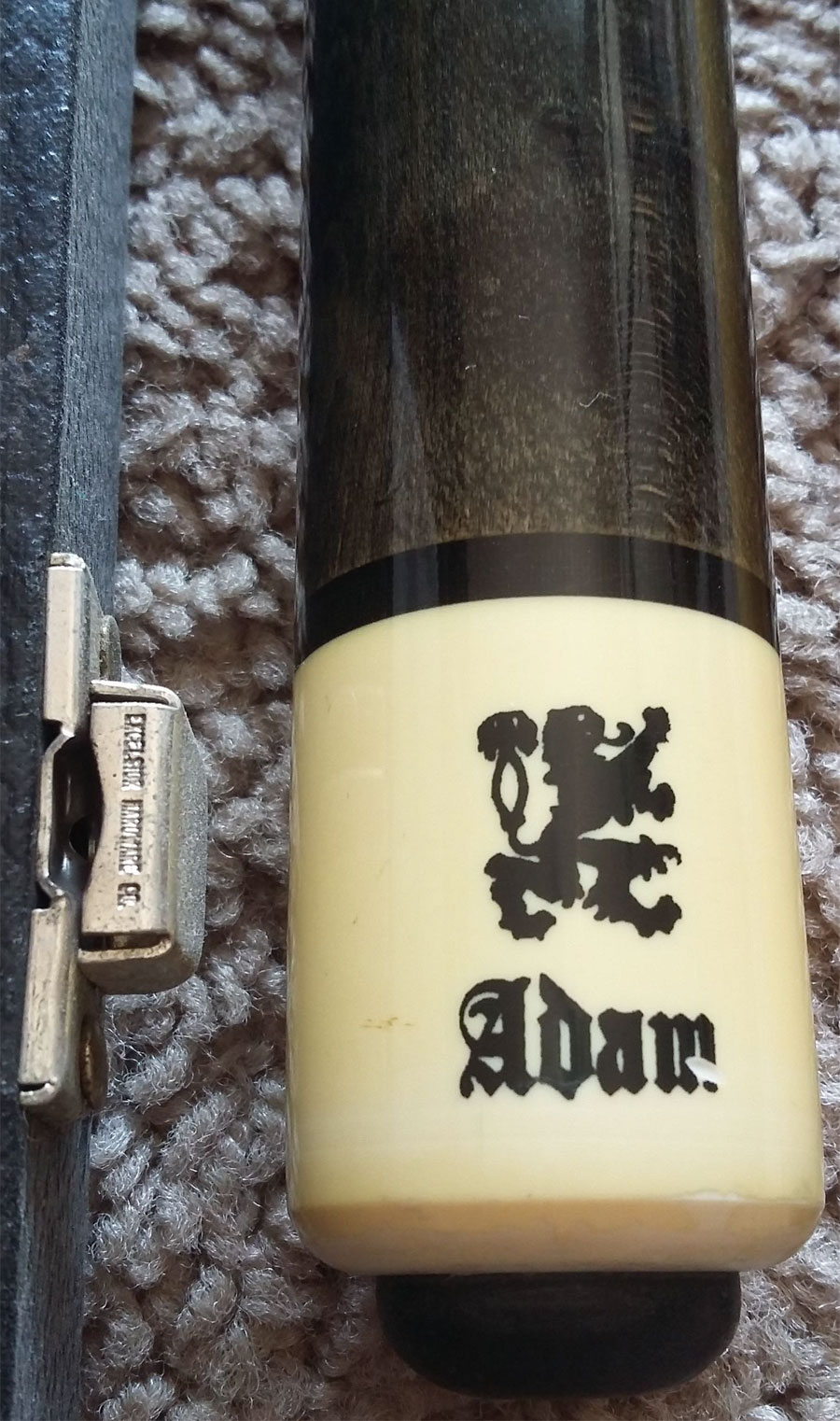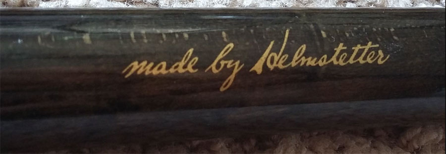 The cue itself says "Adam" on the butt, and "Made by Helmstetter" on the forearm. The markings above the word "Helmstetter" are not dings but the actual wood grain/imperfections.