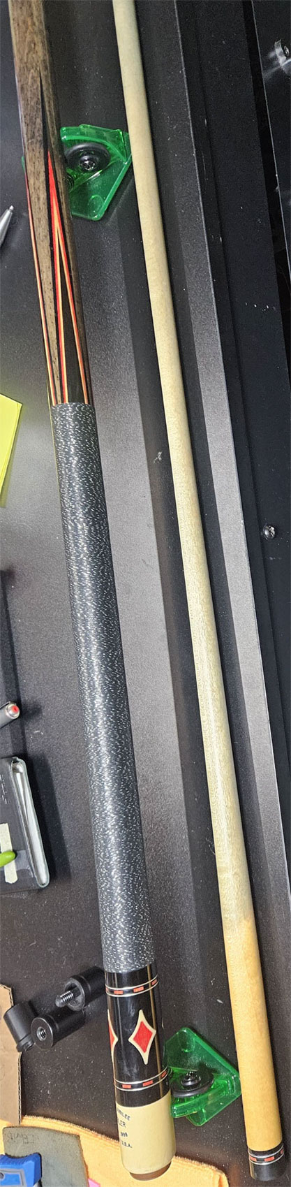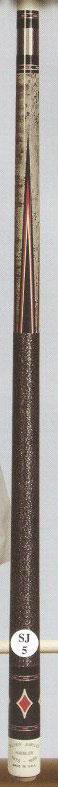 Four point birdseye maple front stained gray. Black, red and maple veneers with Ebony points. Ebony sleeve with alternate ivory and red vencer diamonds. Silver colored rings and veneer dashes throughout cue.