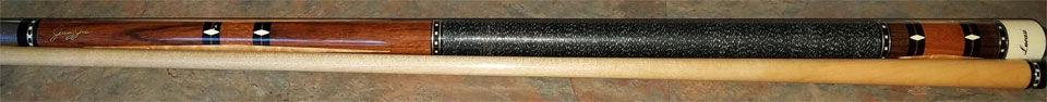 Lucasi pool cue with a walnut forearm with four large birdseye maple diamonds. There are also many ivorine and ebony inlay. The butt matches the forearm. This cue features five sets of bushka style ring. The joint is phenolic with the uniloc joint. This pool cue comes with one shaft with a 13mm pro taper.