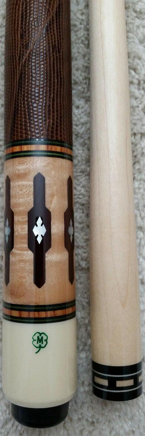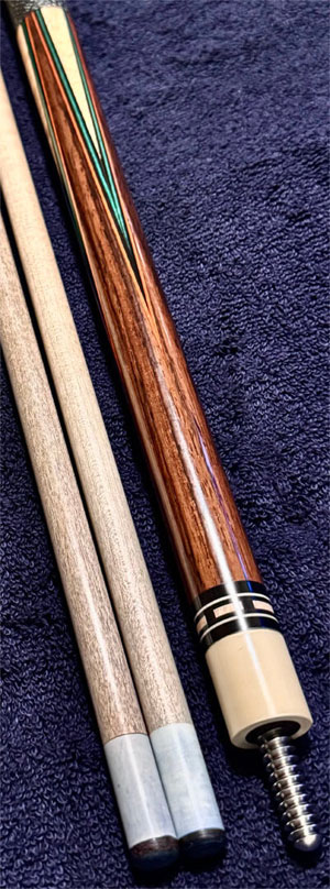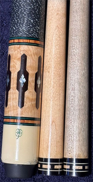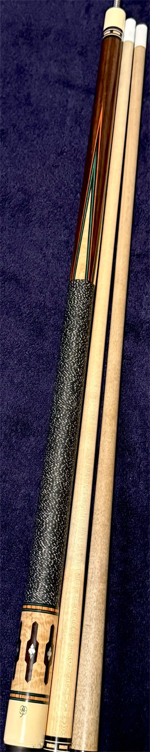 On this particular cue, McDermott started with a Rosewood forearm with four walnut-stained Birdseye Maple points, each with four with veneers of orange, black, green and black. The detailed walnut-stained Birdseye Maple butt sleeve has six pearl notched diamond-shaped inlays set in long thin Rosewood windows between elaborate rings at top and bottom. Each set of rings is black, green, black, then a thicker piece of Tulip wood, and another set of the black and green rings. The Birdseye sleeve in this cue has lots of “eyes” and character as it is highly figured and has a beautiful grain.