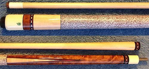 Apparently that particular cue could be ordered with multiple stain color options in the butt sleeve since it has two separate pieces of solid wood e.g. above and below that ring. I learned this in reading about the TWO McDermott D-series collections that JaxRabbit had put together and fully restored: