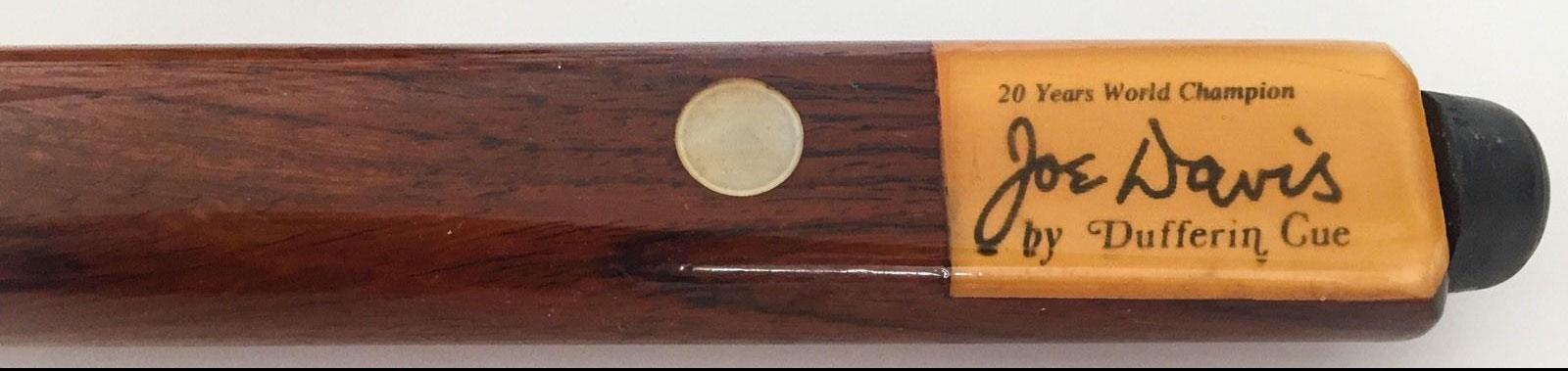 It is labeled with Joe Davis' signature plus the words "20 Years World Champion" - it is a cue made by the Canadian cue manufacturer Dufferin (as noted on the handle) and apparently distributed exclusively in the U.K. By Peradon.
