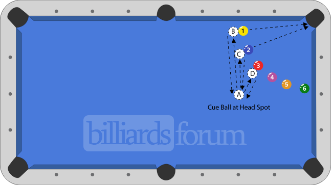 Begin at position A, pocketing the 1-Ball in the corner with a crisp stroke of the cue. The result should be the cue ball floating on its natural path back, and over to position C, leaving the necessary angle to easily pocket the next ball. Continue down the line as far as possible.