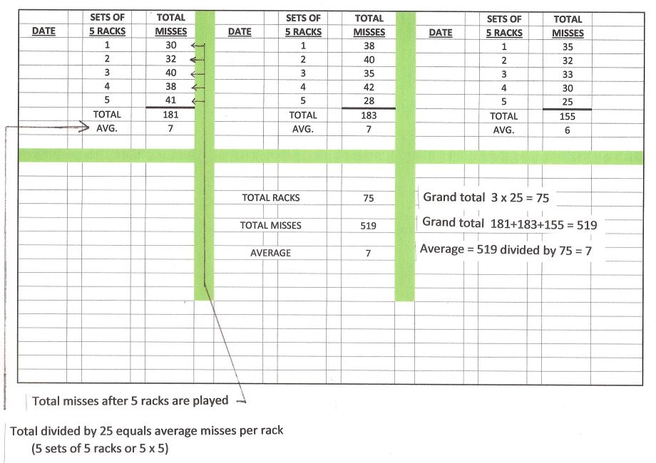 I play 5 racks at one session, use score board to keep count of misses each rack. Post the combined total of all 5 racks on an Excel Spread Sheet for five sessions and it calculates the totals and averages. From January through December I have played a total of 1500 racks with an average of 6 misses per rack. Naturally my goal is 5.