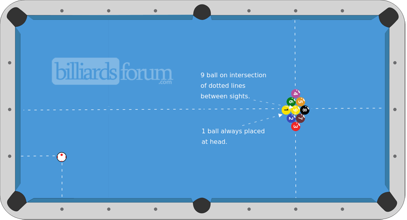 Care should be used to ensure the rack lines up with the center sights at the head and foot of the pool table and with the second sights from the foot of the table on the side rails.