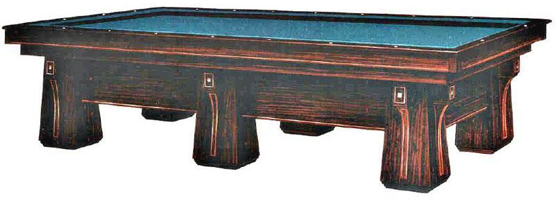 The Slate Bed: The slate bed consists of three pieces of the best quality slate, regulation size 1 inch thick, with all joints secured by brass dowels and sockets. It has no screw holes on the playing surface. If desired, 1 1/2" slate can be furnished.