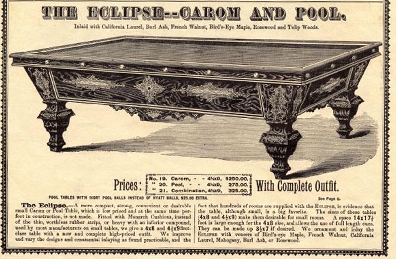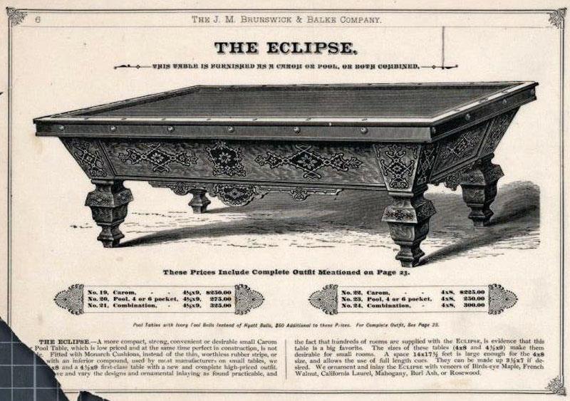 Here is the technical information on the Brunswick Eclipse pool table from page 5 of the 1882 J. M. Brunswick and Balke Co. illustrated price list: