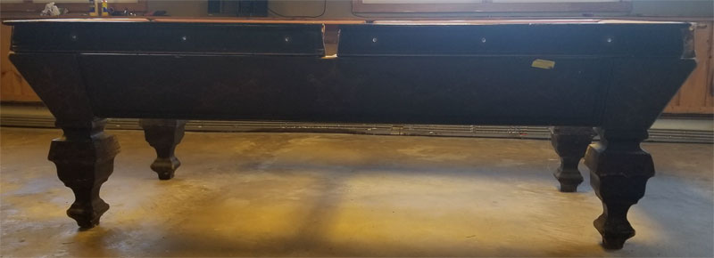 I just picked up this antique billiard table that has some beautiful inlay on the cabinet and legs, as well as a 4-piece slate table top.