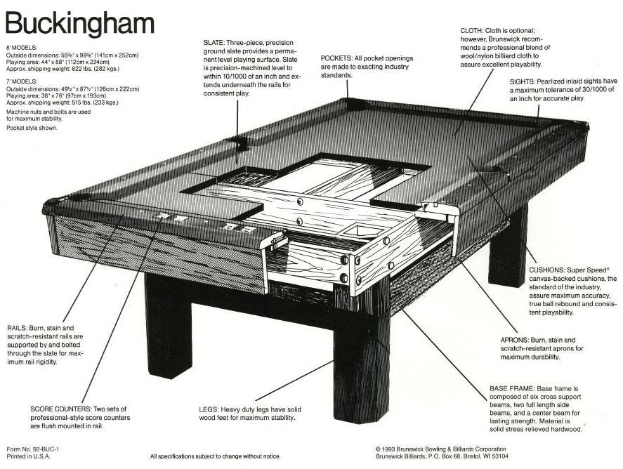 The Buckingham is available in seven and eight foot models with automatic returns or in traditional pocket style.