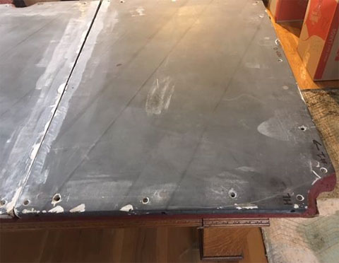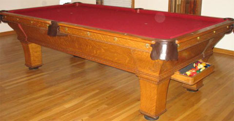 I need some help identifying a pool table which, I am told, is probably from the 1890s. It is a 9' oak pool table with rosewood rails, and has a three-piece slate.