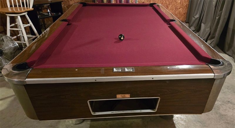 I bought this from a bar that has been opened since 1969. I had it professionally moved, recovered and set up as pictured. I believe it is a National Shuffleboard 'Pro-8' model pool table (92 x 46).