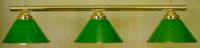 We bought an inexpensive three-shade hanging bar light from Mueller Sporting Goods. We've seen this same light, with only slight variations, for approximately $230 (from Connelly Billiards), approximately $165 (a local billiards store), and approximately $90 (from the Mueller catalog). It pays to shop around.The primary difference between the one from Mueller and the one from Connelly was that the Connelly light had fancy end-caps at each end of the brass bar. The ends of the brass bar from Mueller are flat and unadorned.