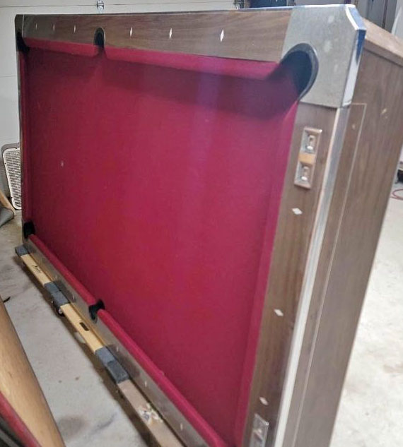 I'm buying an old Fisher pool table with a 1-piece slate. They have the pool table tipped up on 3 small skids or dollies as shown in the photo below.