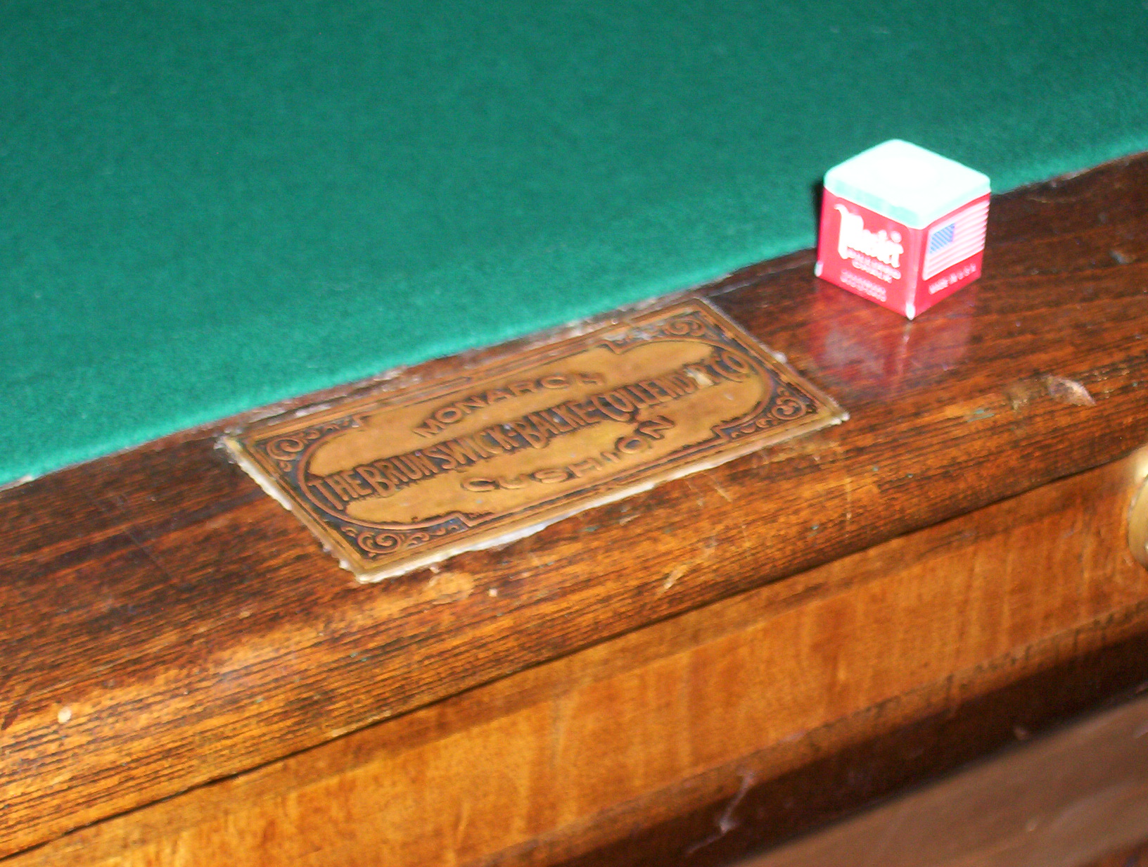The billiard table is a 4x8 Brunswick Victor from 1912-15. I bought it in 1993 for $300 - it was in pieces, missing pockets, missing diamonds in the rails, rotted cushions. I spent the winter of 1993-1994 restoring it, and now moved it to my new home. It was due for recovering anyway, so she got new cloth out of the deal.