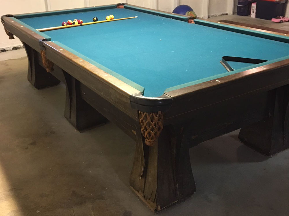 We have a Brunswick Balke Collender pool table, circa 1923, for sale as shown below. We're not sure of the model, but given the shape of the legs and the year, we're guessing a custom version of the Medalist. The first leg shows the most wear on the veneer, while the rest have minor dings and such. The table is dusty, but shows the cobwebs well.