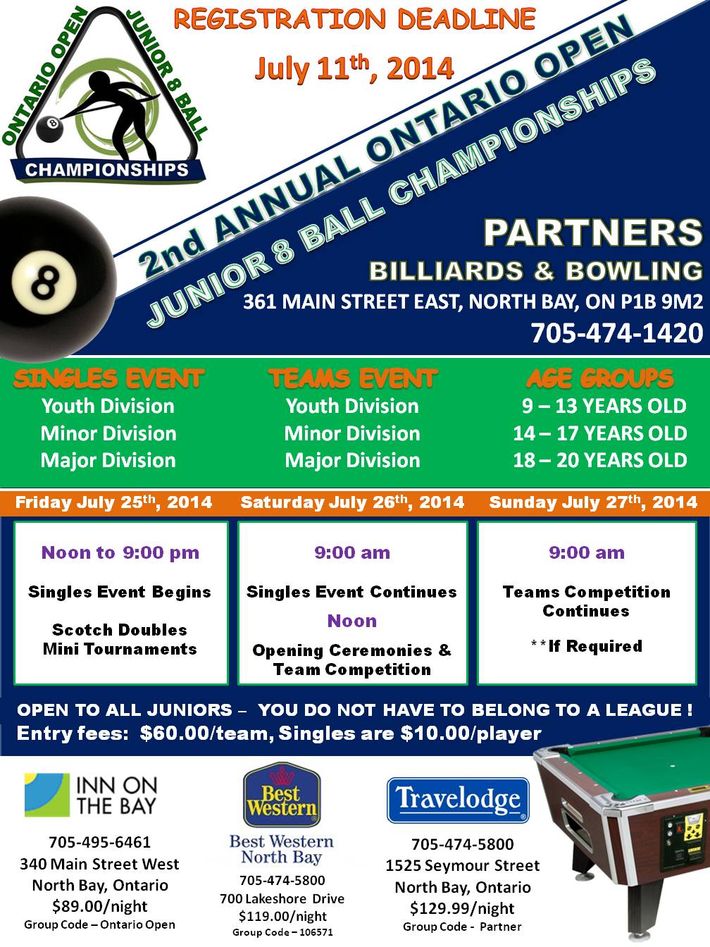 The event is being held in North Bay, Ontario on July 25th & 26th 2014 and is open to all Juniors, including those that are not part of a pool league - it is a great opportunity for Junior Players. More Information can be found at partnersjuniorpool.com.
