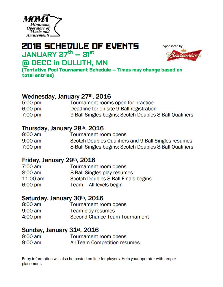 If you are looking for an 8 ball or 9 ball tournament in the Duluth, MN area, look no further than the 36th Annual MOMA State Pool Tournament. It is being held in Rochester MN from January 27, 2016 to January 31, 2016, at the Duluth Entertainment Convention Center (DECC).
