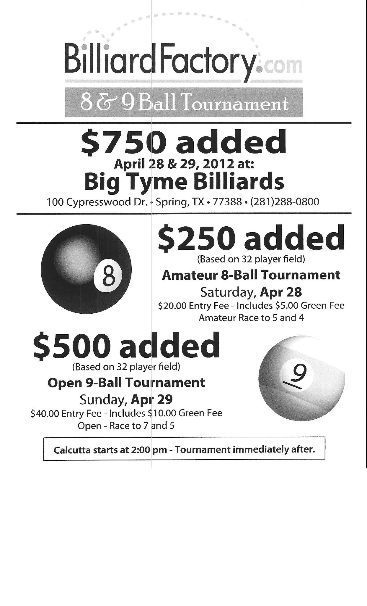 The Billiard Factory is sponsoring an open Amateur 8 Ball and open 9 Ball pool tournament which is taking place on April 28th and 29th 2012 at Big Tyme Billiards in Spring, TX.