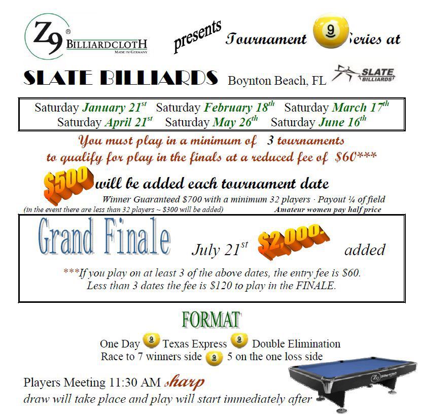 Z9 Billiard Cloth presents the 9-Ball Tournament Series at Slate Billiards in Boynton Beach FL.