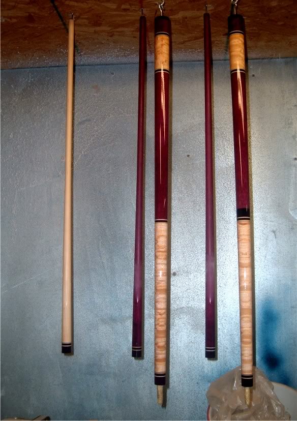 They will feature purpleheart shafts and also a maple player shaft. Both of these BHQ custom pool cues have purpleheart rings, except the buttcap. I cooked the rings in the oven to darken them and it worked almost too well, and they came out a little darker than I wanted them to. I never said that I knew how to cook!