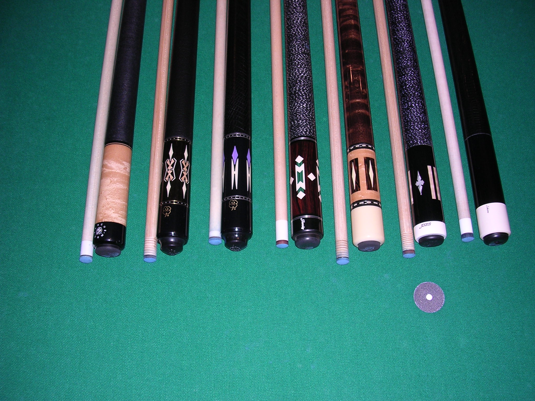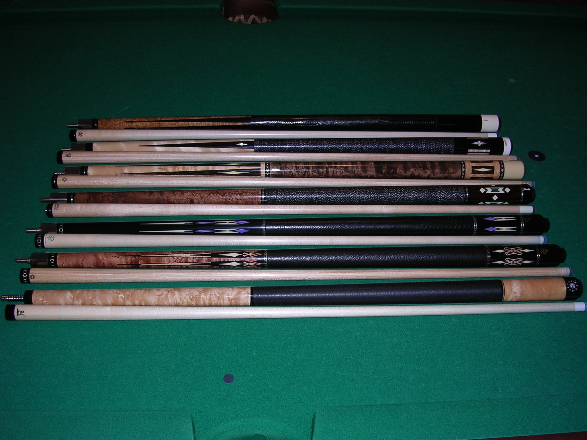 BilliardsBill on 6/14/2012 11:02:23 PMThese are my top 7 cues from the top down: 1. Schon with a leather wrap and a Tiger Ultra X shaft.2. Joss with Irish Linen wrap and an OB-1 shaft.3. Pechauer Pro Series wrapless with an OB-1 shaft.4. Jacoby with Irish Linen wrap and a Mezz WD 700 shaft.5. McDermott Elite Series Bridgeport with a Leather wrap and an I-2 shaft.6. McDermott Elite Series Voyager with a Leather wrap and an OB-1 shaft.7. Samsara Bar Cue with Irish Linen wrap and a Predator 314-2 shaft. I use and love all of my cues. They are not in order of my most to least favorite because they are like my children. I love them all equally. These are just 7 of the over 30 cues that I own.