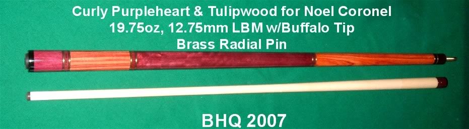 - Title: Noel's New BHQ Curly Purpleheart and Tulipwood Cue