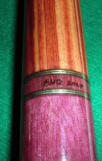 This is a curly purpleheart and tulipwood BHQ custom pool cue for Noel Coronel (NBC on AZB & EPT). If he ever gets his butt back from vietnam to home. This BHQ custom pool cue was designed by the buyer, Noel. It was designed to look similar to a Jim Buss cue he once saw somewhere. The cue features a radial pin, and will be between 19 oz and 19.50 oz with a 12.75m shaft.